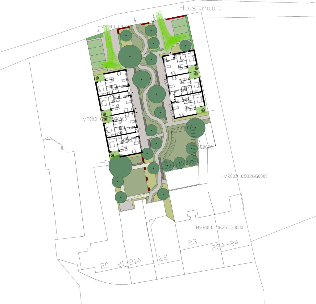Aansluitend bij de bestaande bebouwing worden de nieuwe woningen ontworpen in een ingetogen, eigentijdse architectuur en zijn ze geschikt voor toekomstbestendig wonen. Aanwezige oude tuinmuren worden opgenomen in het ontwerp. Gebouwen zijn terughoudend. De gemeenschappelijke tuin staat centraal en fungeert als semi openbare ruimte als een aangename ontmoetingsplek.