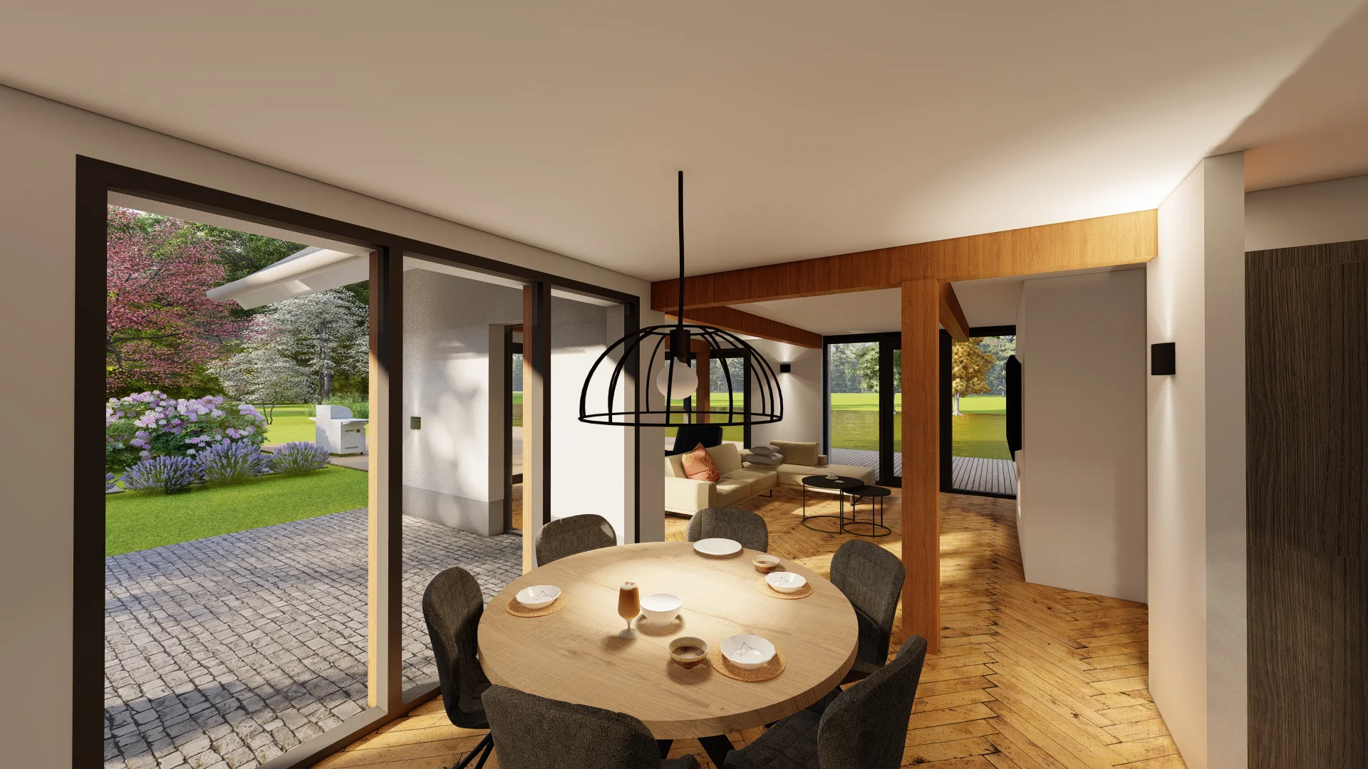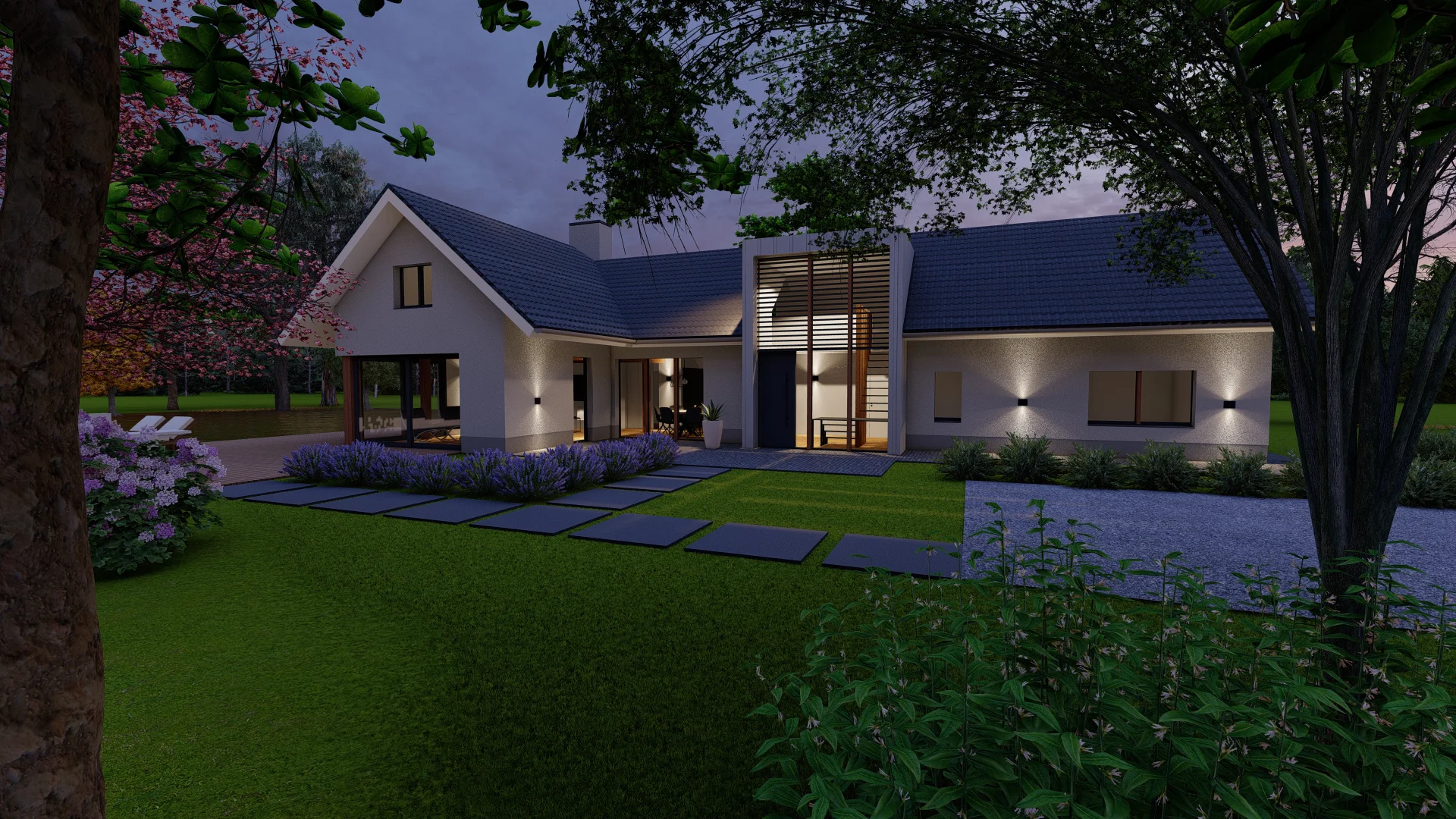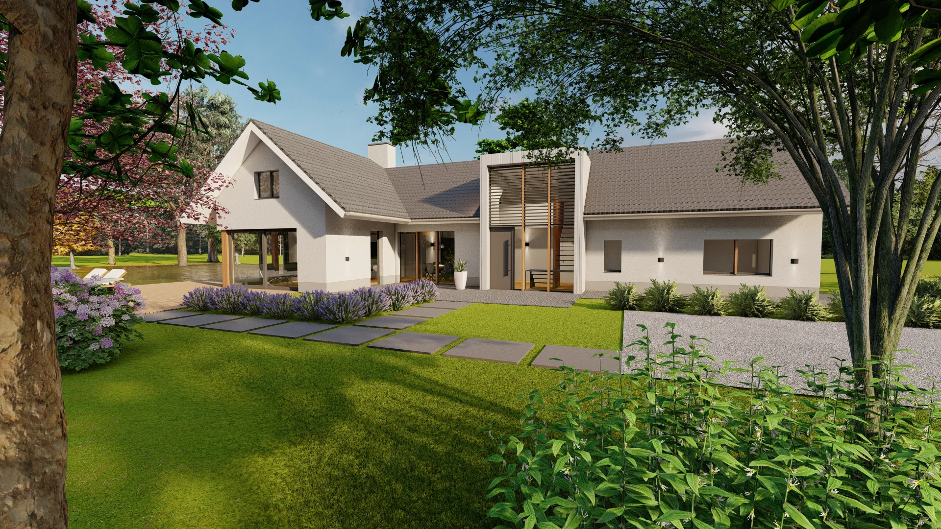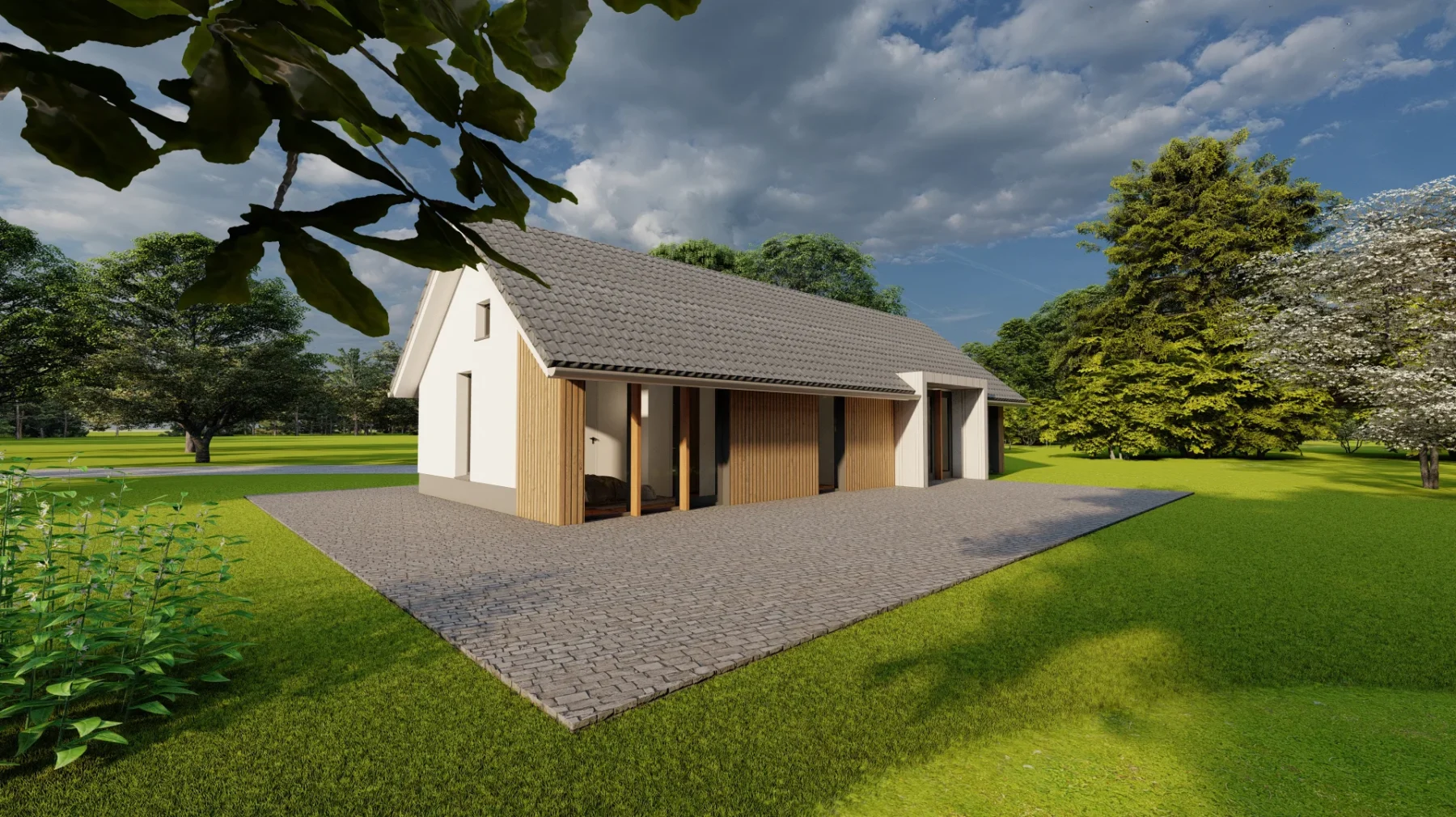 De vrijstaande villa aan de Oirschotsebaan 2 te Oisterwijk is prachtig gelegen in de Oisterwijkse bossen. Het royale landgoed draagt de naam “Nooitgedacht”. Aan de Oirschotsedijk staat de naam aangeduid op de metselwerk penanten en het ontwerp dateert uit de jaren ’60 van de vorige eeuw. De oorspronkelijke villa is te typeren als een bescheiden landhuis. Bijzondere stijlkenmerken met houten details, gevelbekledingen, een gemetseld rookkanaal, houten raamkaders en een spel van samengestelde daken bepalen het architectonisch beeld. Het kleurenpalet van witte gevels, donkere kozijndetails en daken van grijze keramische pannen karakteriseren de woning en geven de villa een “eigen plek” in het bos. De ambitie van de opdrachtgevers, om de prettige “look & feel” van de woning als uitgangspunt te nemen voor het ontwerp, is vertaald in het plan. De opgave bestaat uit het restylen en verbouwen van de hoofdbouw en het realiseren van een mantelzorgwoning op het perceel. In het ontwerp is de begane grond van de bestaande woning verlaagd om hoogte te winnen. In een geheel nieuwe gevelbekleding van mineraal stucwerk en hout is met nieuwe gevelopeningen op een eigentijdse manier aangesloten bij de oorspronkelijke uitstraling van de woning.