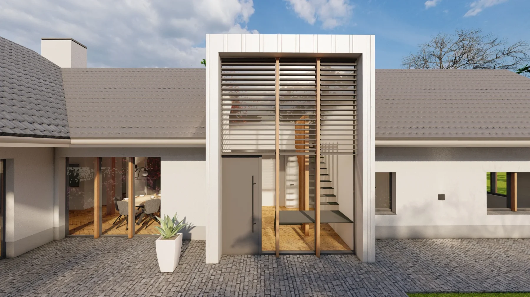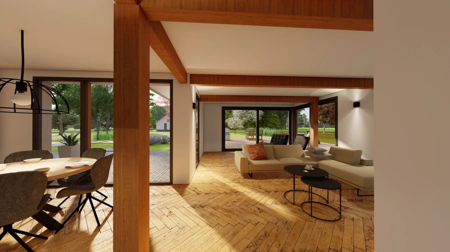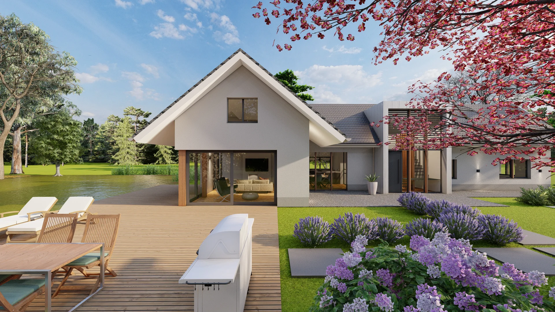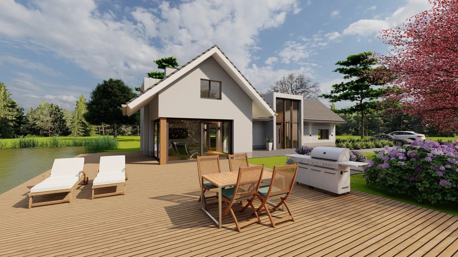 De vrijstaande villa aan de Oirschotsebaan 2 te Oisterwijk is prachtig gelegen in de Oisterwijkse bossen. Het royale landgoed draagt de naam “Nooitgedacht”. Aan de Oirschotsedijk staat de naam aangeduid op de metselwerk penanten en het ontwerp dateert uit de jaren ’60 van de vorige eeuw. De oorspronkelijke villa is te typeren als een bescheiden landhuis. Bijzondere stijlkenmerken met houten details, gevelbekledingen, een gemetseld rookkanaal, houten raamkaders en een spel van samengestelde daken bepalen het architectonisch beeld. Het kleurenpalet van witte gevels, donkere kozijndetails en daken van grijze keramische pannen karakteriseren de woning en geven de villa een “eigen plek” in het bos. De ambitie van de opdrachtgevers, om de prettige “look & feel” van de woning als uitgangspunt te nemen voor het ontwerp, is vertaald in het plan. De opgave bestaat uit het restylen en verbouwen van de hoofdbouw en het realiseren van een mantelzorgwoning op het perceel. In het ontwerp is de begane grond van de bestaande woning verlaagd om hoogte te winnen. In een geheel nieuwe gevelbekleding van mineraal stucwerk en hout is met nieuwe gevelopeningen op een eigentijdse manier aangesloten bij de oorspronkelijke uitstraling van de woning.