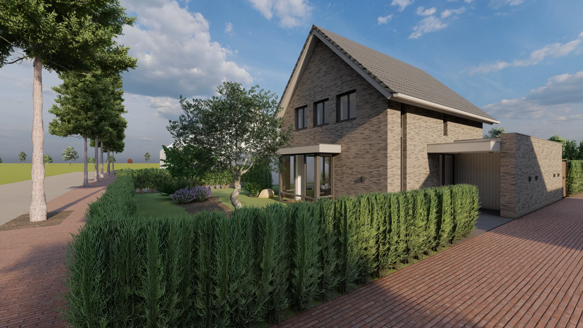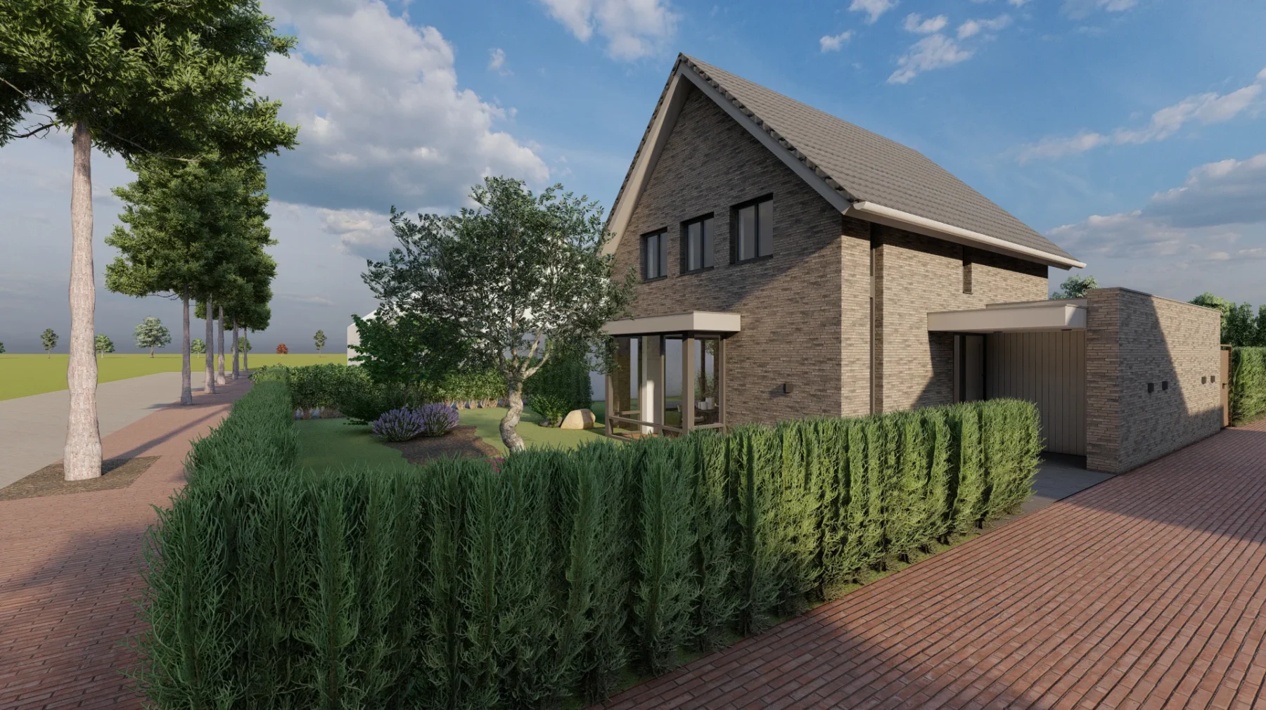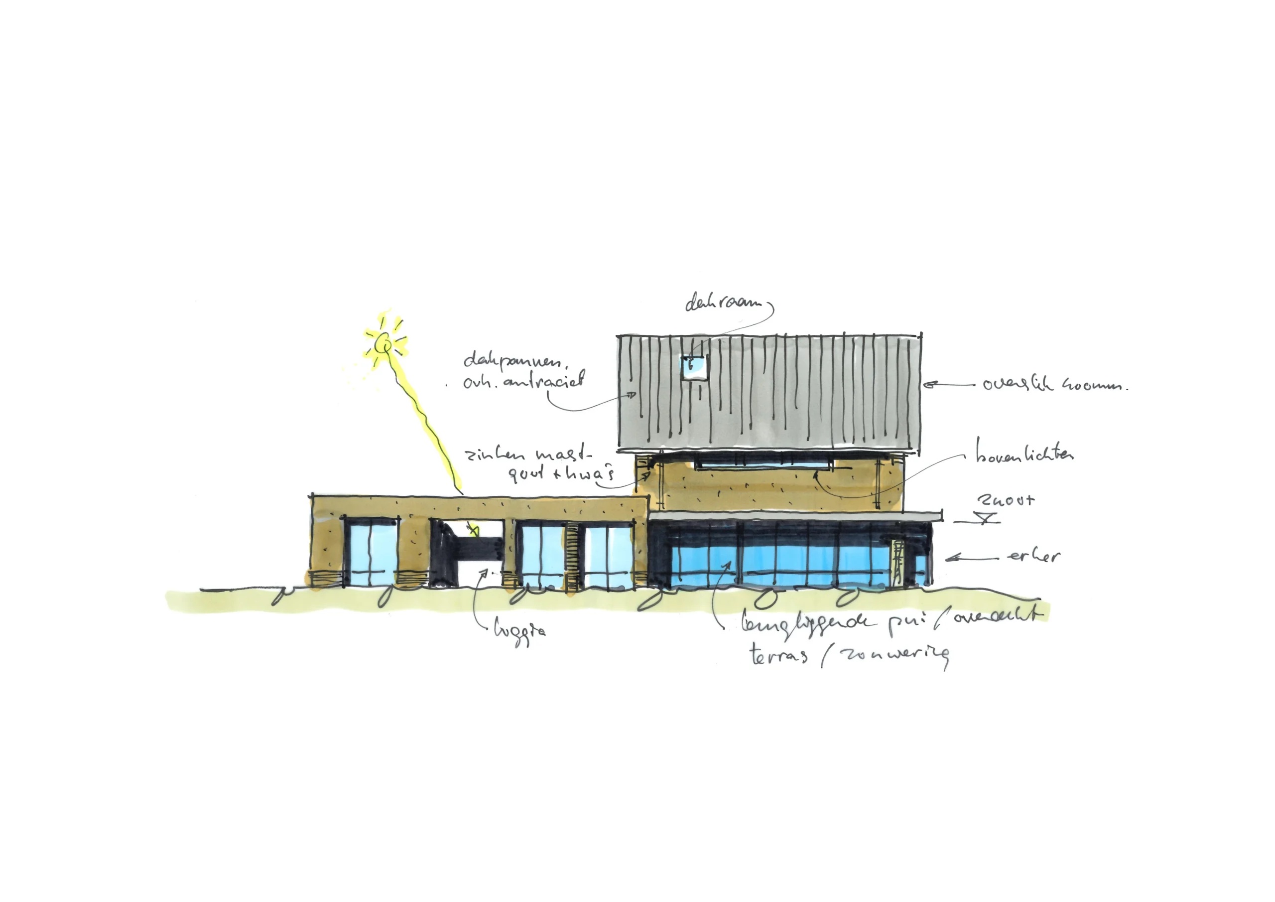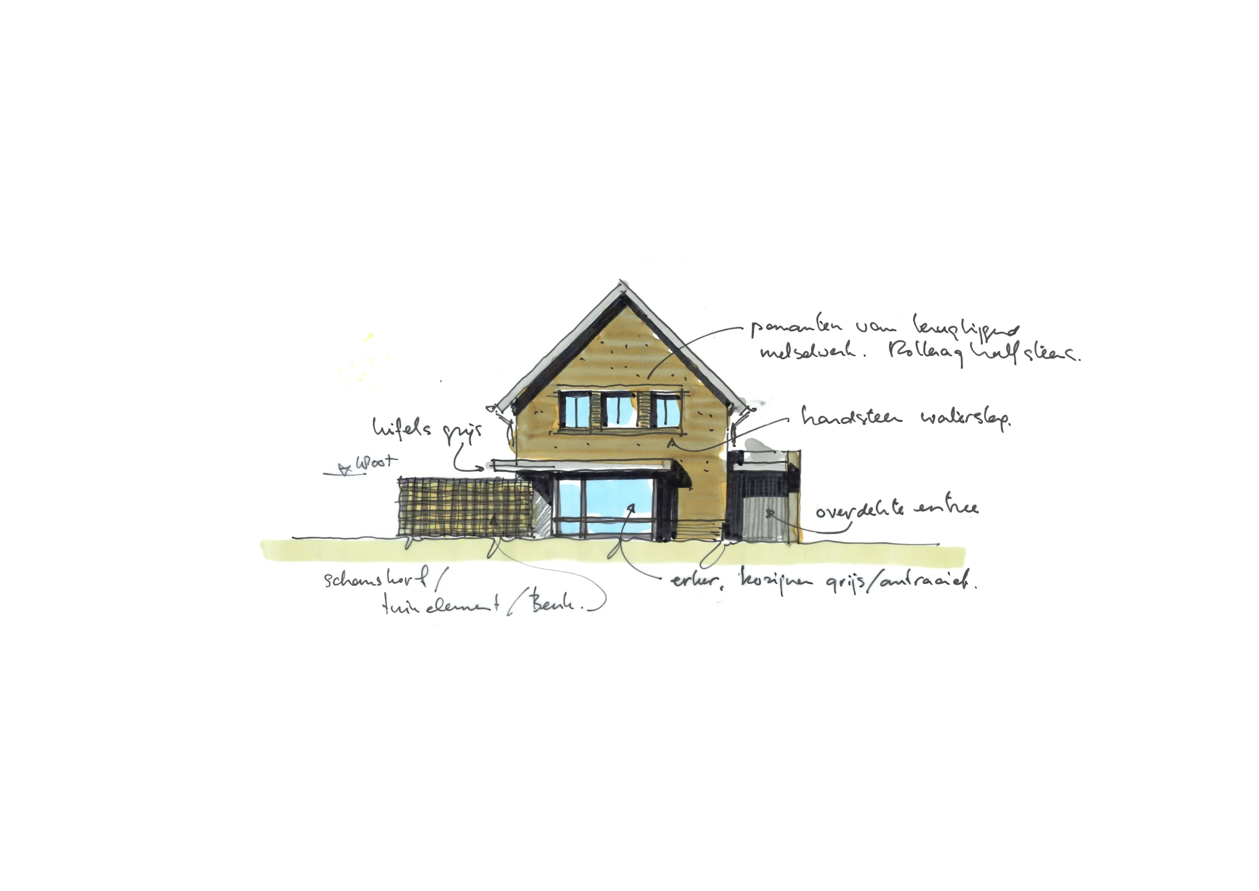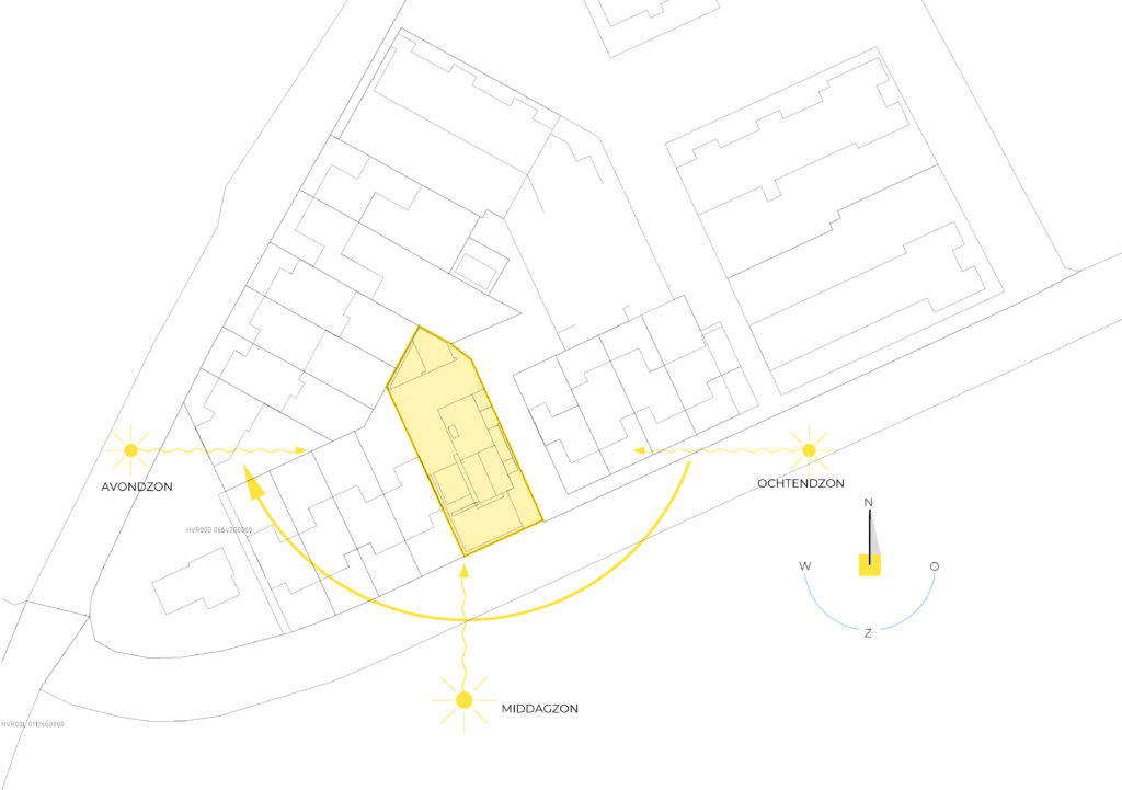 De vorm en situering van het perceel hebben geleid tot een ontwerp waarbij optimaal wordt ingespeeld op bezonning en relatie van de woning met het openbaar gebied. Het bouwvolume is in de lengte in Noord-Zuid richting op het perceel gelegd. Het hoofdgebouw wordt zo dicht mogelijk tegen de Oostelijke perceelsgrens gelegd om maximaal gebruik te kunnen maken van de middagzon. Hier bevindt zich de entree van de woning. Tevens zijn aan deze koele kant de verkeers- en bergruimten gesitueerd. Op deze wijze kunnen de verblijfsruimten op de begane grond maximaal gebruik maken van de middagzon. De eetkamer combineert een straat oriƫntatie met privacy in de tuin (terras) door een bouwkundige of tuinafscheiding. De toekomstbestendige slaap- en badkamer zijn achter het hoofdgebouw gesitueerd. De bescheiden verdieping vormt een knipoog naar de oorspronkelijke symmetrie in de verdwenen woning. De nieuwe woning is eigentijds vormgegeven met verwijzingen naar stijlkenmerken. De gemetselde gevels worden in een aardse kleuren uitgevoerd met een dak van keramische dakpannen. Gootlijsten en kozijnen en overstekken worden uitgevoerd in een lichtgrijze kleur.