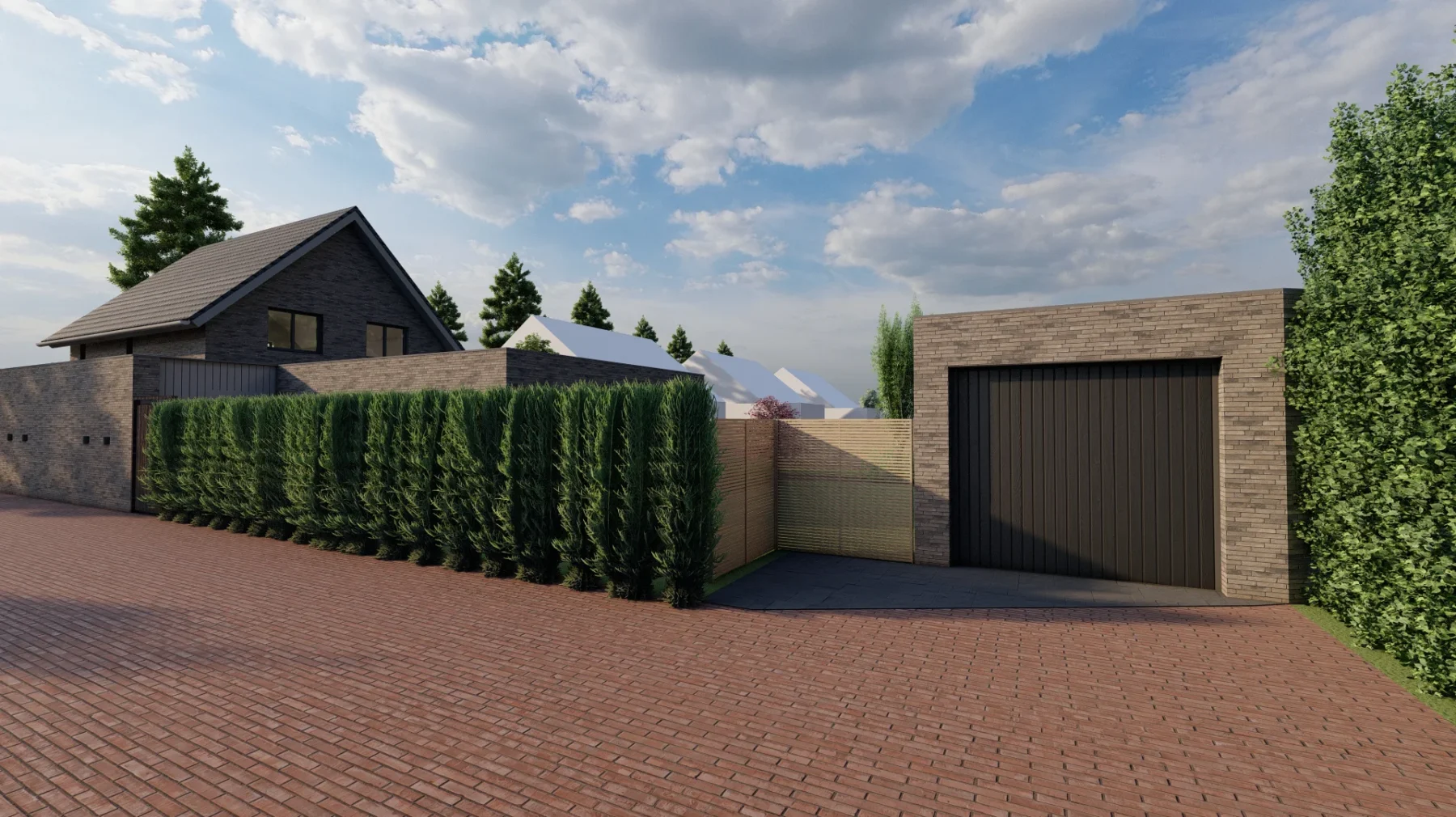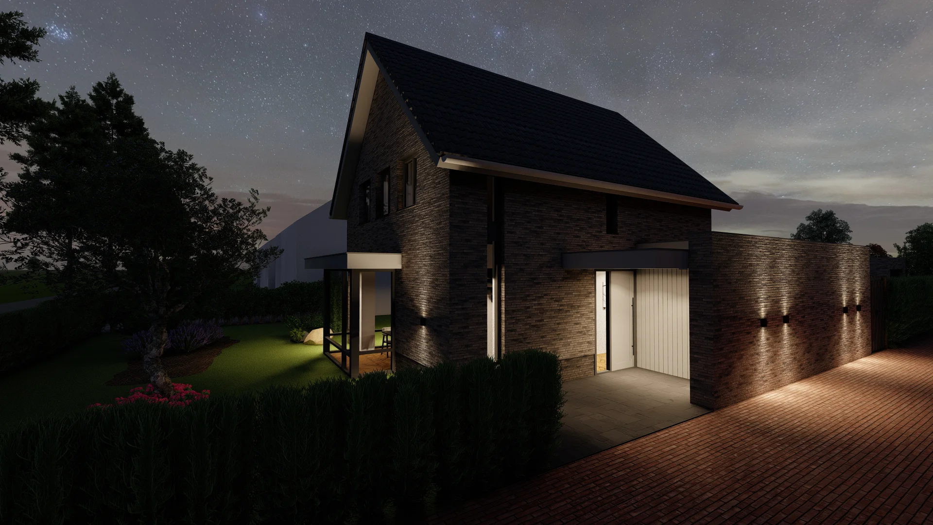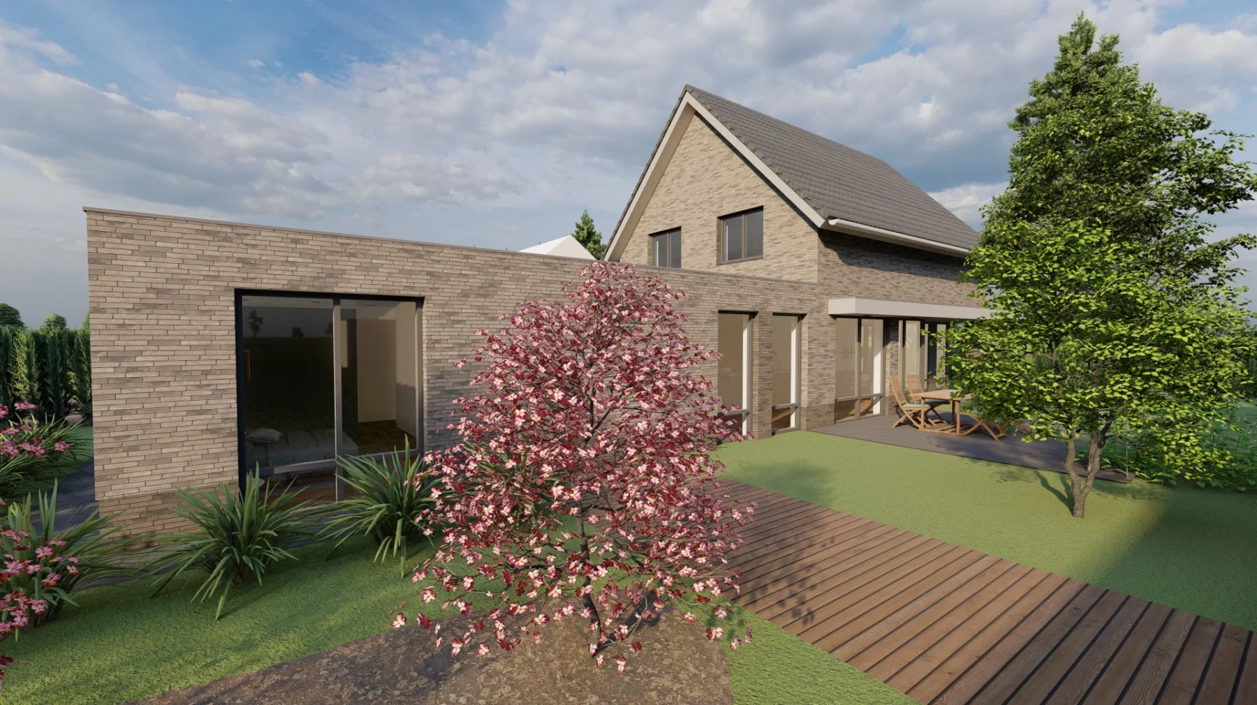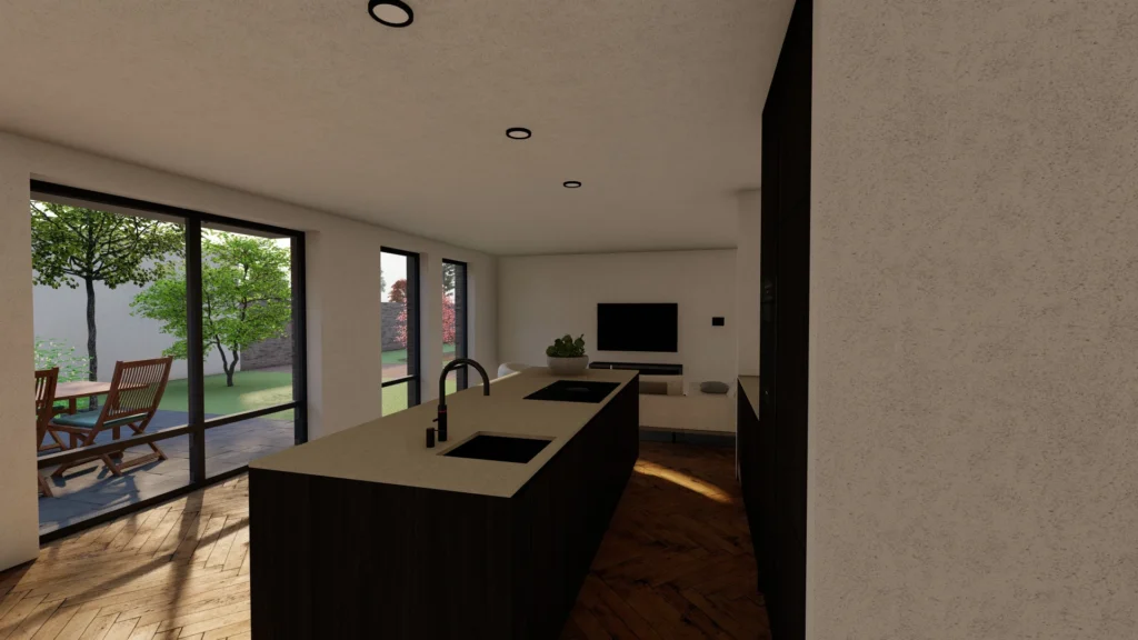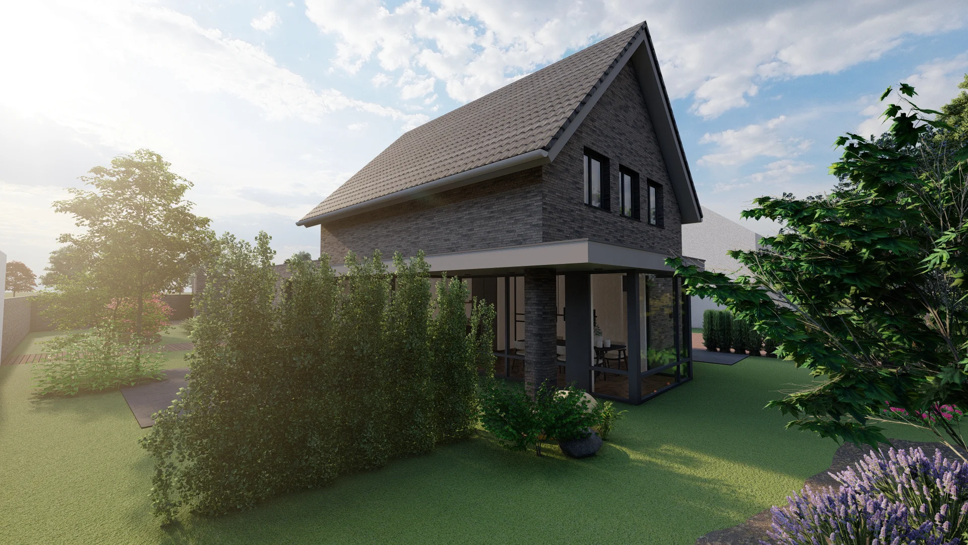 De vorm en situering van het perceel hebben geleid tot een ontwerp waarbij optimaal wordt ingespeeld op bezonning en relatie van de woning met het openbaar gebied. Het bouwvolume is in de lengte in Noord-Zuid richting op het perceel gelegd. Het hoofdgebouw wordt zo dicht mogelijk tegen de Oostelijke perceelsgrens gelegd om maximaal gebruik te kunnen maken van de middagzon. Hier bevindt zich de entree van de woning. Tevens zijn aan deze koele kant de verkeers- en bergruimten gesitueerd. Op deze wijze kunnen de verblijfsruimten op de begane grond maximaal gebruik maken van de middagzon. De eetkamer combineert een straat oriƫntatie met privacy in de tuin (terras) door een bouwkundige of tuinafscheiding. De toekomstbestendige slaap- en badkamer zijn achter het hoofdgebouw gesitueerd. De bescheiden verdieping vormt een knipoog naar de oorspronkelijke symmetrie in de verdwenen woning. De nieuwe woning is eigentijds vormgegeven met verwijzingen naar stijlkenmerken. De gemetselde gevels worden in een aardse kleuren uitgevoerd met een dak van keramische dakpannen. Gootlijsten en kozijnen en overstekken worden uitgevoerd in een lichtgrijze kleur.