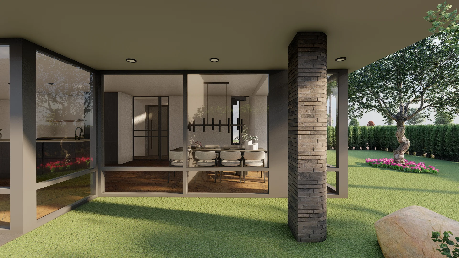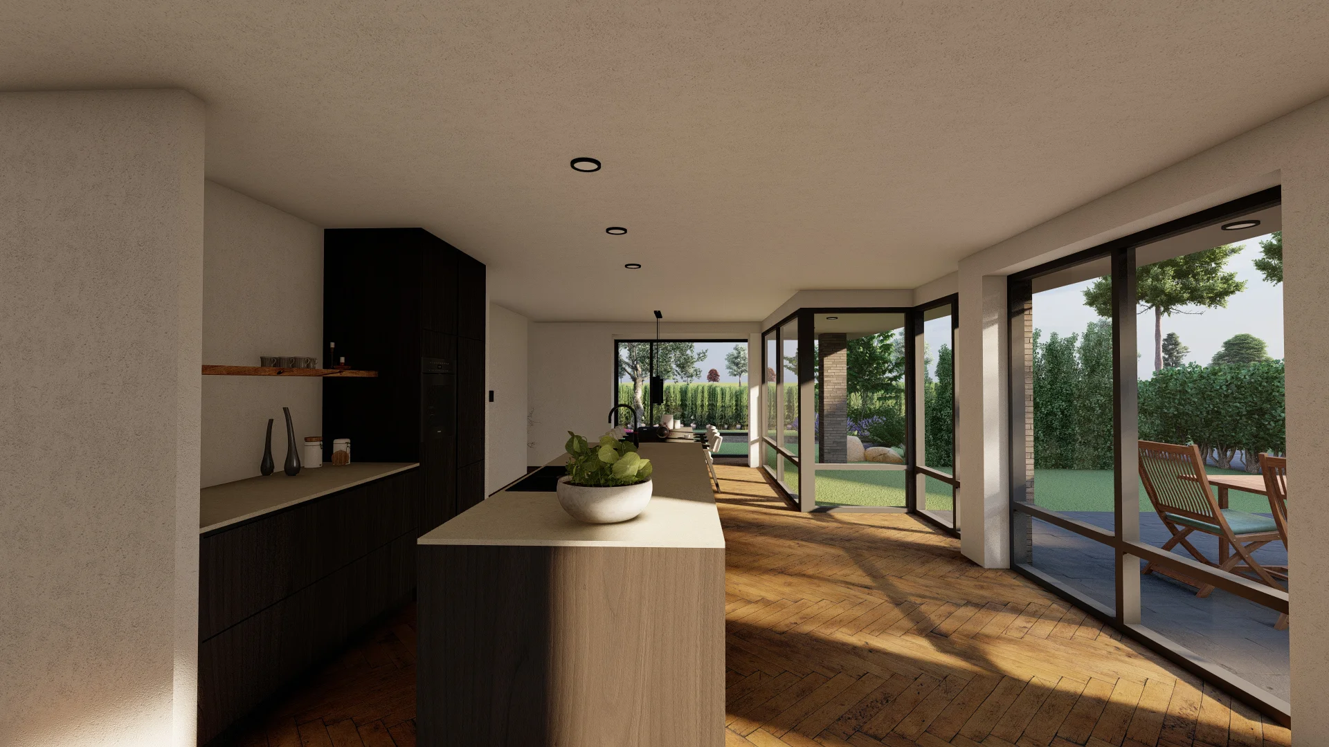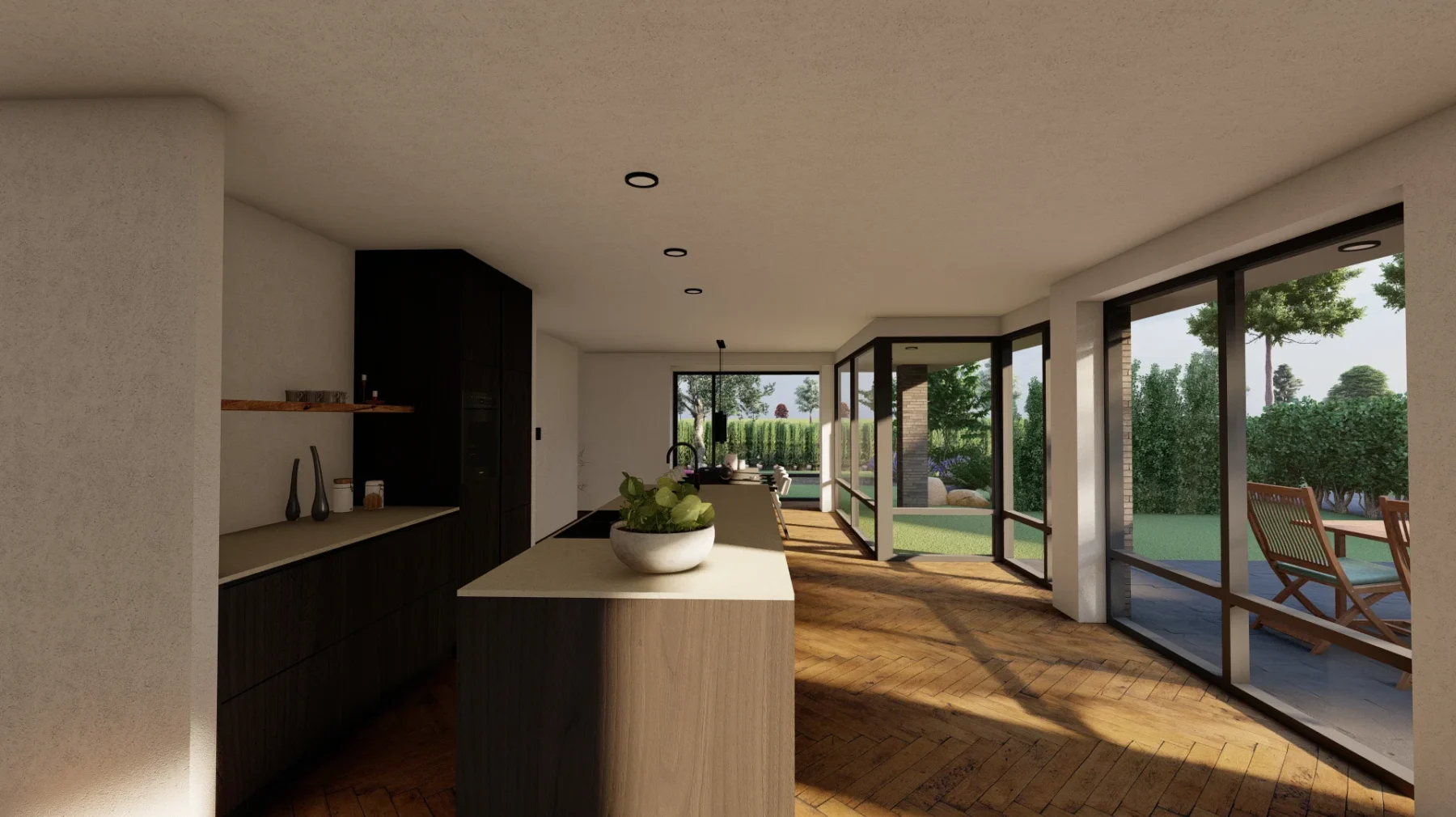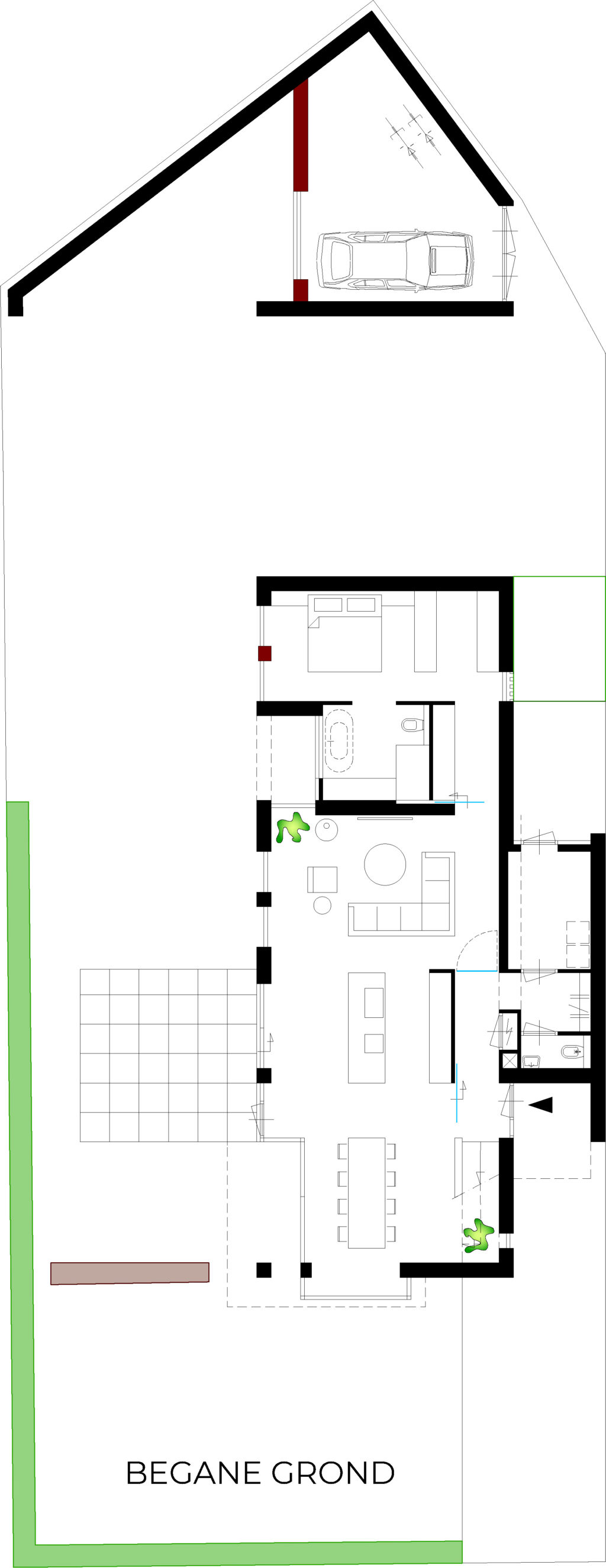 De vorm en situering van het perceel hebben geleid tot een ontwerp waarbij optimaal wordt ingespeeld op bezonning en relatie van de woning met het openbaar gebied. Het bouwvolume is in de lengte in Noord-Zuid richting op het perceel gelegd. Het hoofdgebouw wordt zo dicht mogelijk tegen de Oostelijke perceelsgrens gelegd om maximaal gebruik te kunnen maken van de middagzon. Hier bevindt zich de entree van de woning. Tevens zijn aan deze koele kant de verkeers- en bergruimten gesitueerd. Op deze wijze kunnen de verblijfsruimten op de begane grond maximaal gebruik maken van de middagzon. De eetkamer combineert een straat oriƫntatie met privacy in de tuin (terras) door een bouwkundige of tuinafscheiding. De toekomstbestendige slaap- en badkamer zijn achter het hoofdgebouw gesitueerd. De bescheiden verdieping vormt een knipoog naar de oorspronkelijke symmetrie in de verdwenen woning. De nieuwe woning is eigentijds vormgegeven met verwijzingen naar stijlkenmerken. De gemetselde gevels worden in een aardse kleuren uitgevoerd met een dak van keramische dakpannen. Gootlijsten en kozijnen en overstekken worden uitgevoerd in een lichtgrijze kleur.