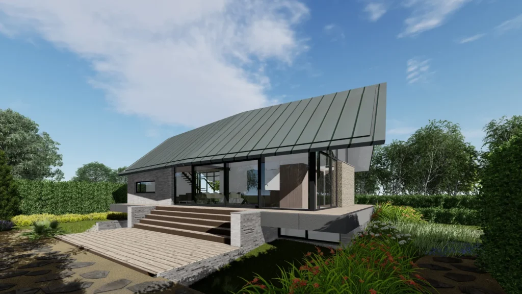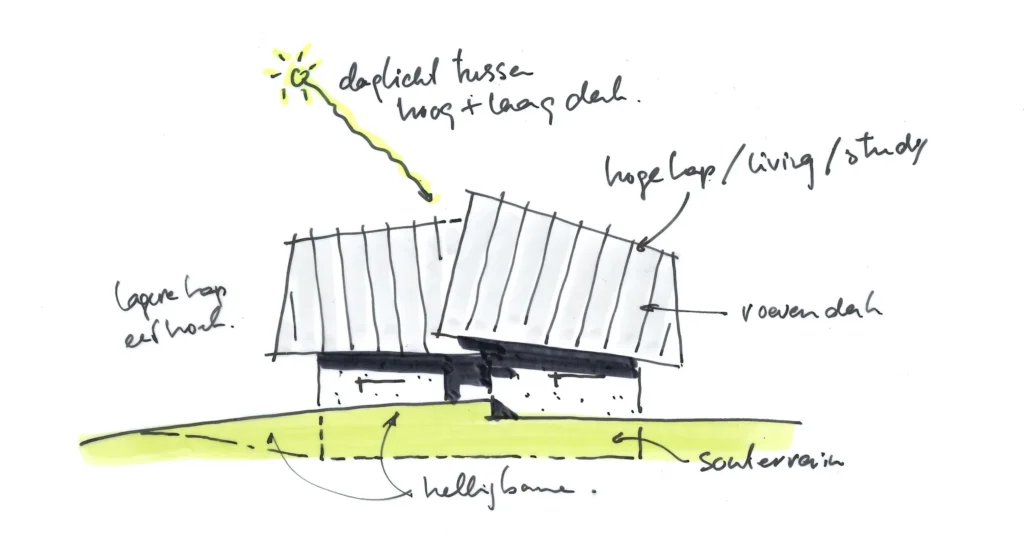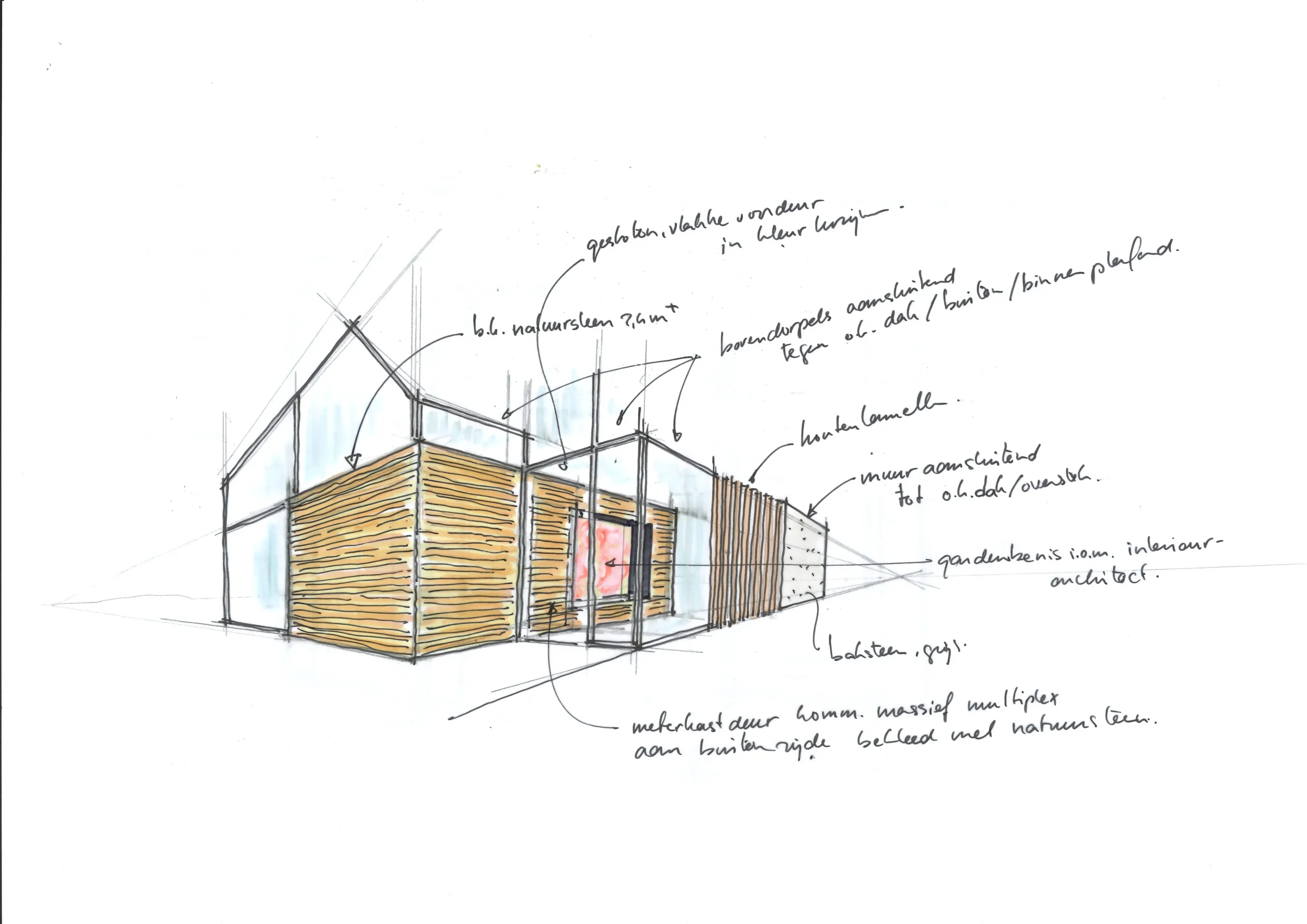 Het ontwerp voor de bijzondere vrijstaande villa aan de Korenbloem te Haaren is geïnspireerd op de levensstijl van de opdrachtgevers, zeezeilers. Op een Ruimte voor Ruimte perceel binnen de kern Haaren ligt een ingeklemde locatie die rondom begrensd wordt door achtertuinen van belendende percelen en een voetpad aan de Oostzijde. In het Beeldkwaliteitsplan dat voor deze locatie geldt wordt een tweezijdige oriëntatie voorgeschreven. Dit heeft in het ontwerp geleid tot een concept dat verschillende richtingen op pakt. Het architectonisch concept is gebaseerd op een spel tussen privacy en openheid. De opgetilde begane grondvloer met daarop een open/gesloten tussenlaag wordt afgedekt met een expressieve dakvorm in een lichte bouwconstructie. De geknikte dakvorm van zinken roeven speelt met de richtingen van het perceel en verwijst naar zeilen van een schip. Het plan sluit meer aan bij de moderne woningen aan de Korenbloem dan bij de dorpse bebouwing aan de Heuvelstraat. De iconische woning voegt zichzelf in de context zonder op te dringen.