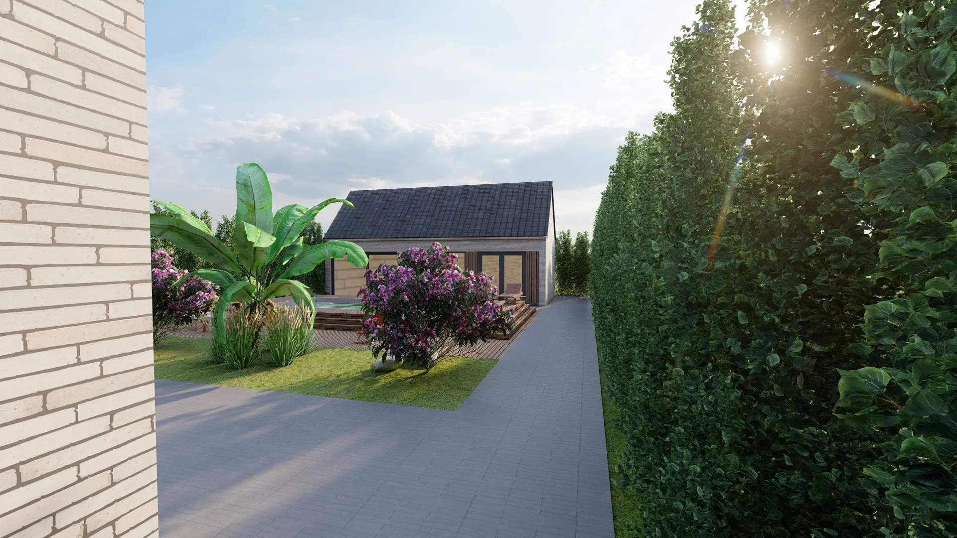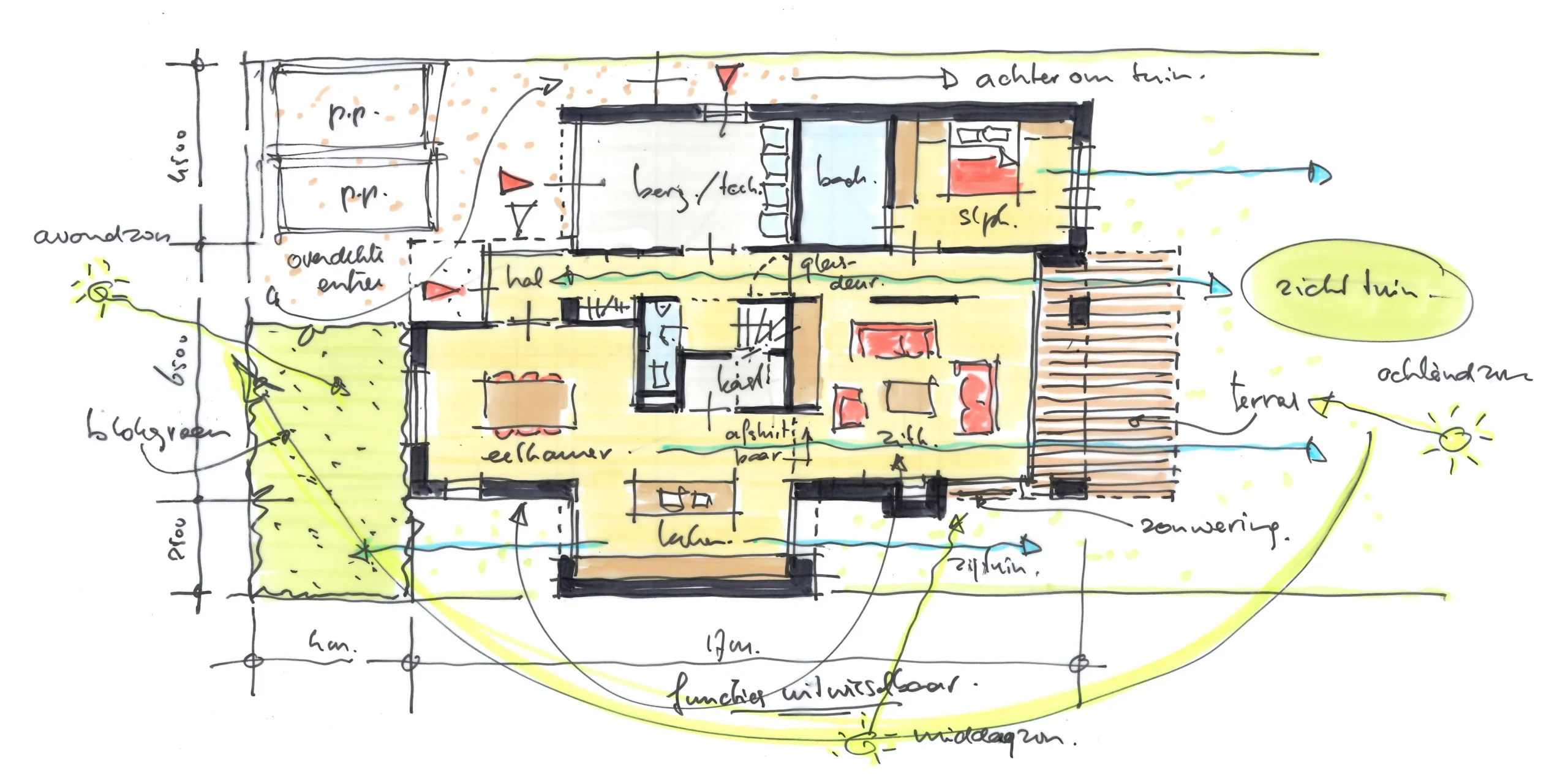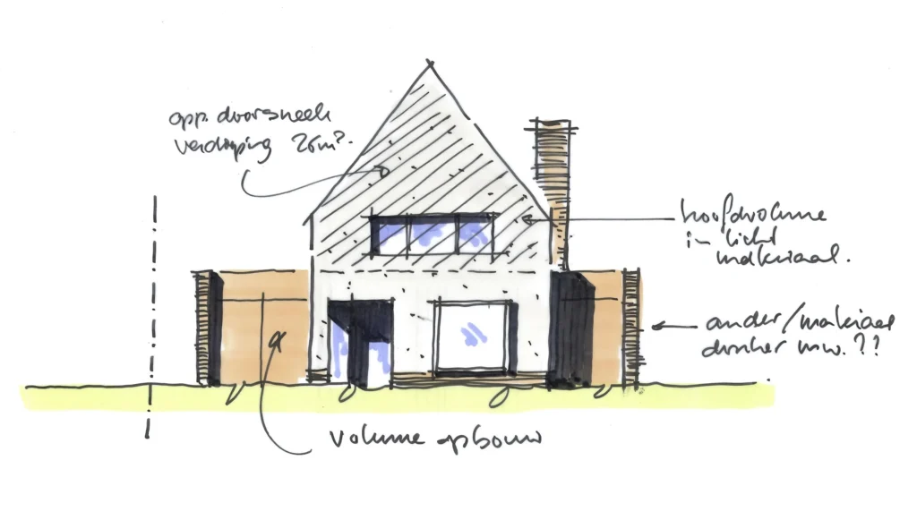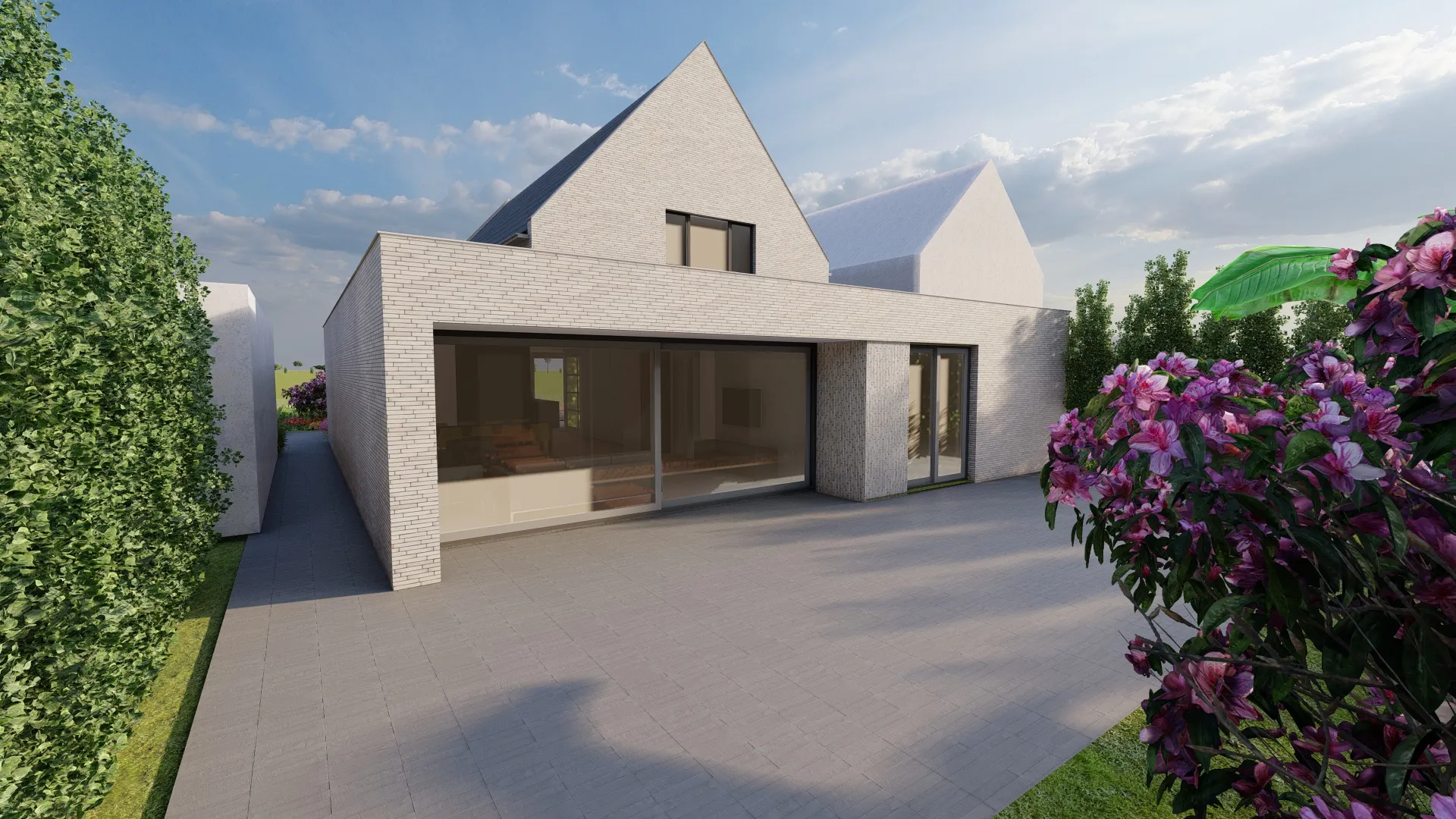 De wens van de opdrachtgevers was een lichte woning met een levensloop programma op de begane grond, een compacte verdieping en een ruim bijgebouw dat tevens dienst kan doen als poolhouse, berging of gastenverblijf. De wens naar een “lïchte woning” is vorm gegeven met een fraaie, slanke baksteen in een lichtgrijze kleur. De woning krijgt daarmee een eigen karakter tussen de beide buurpanden welke van gevelstucwerk zijn voorzien. Fraaie details in de voorgevel zoals de rond gemetselde hoek aan de entreezijde en het houten raster voor de chill-room geven een bijzondere expressie aan de woning.